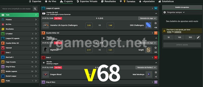 O v68 oferece uma grande seleção de opções de apostas em e-sports com probabilidades competitivas